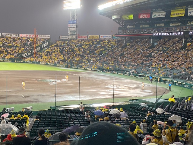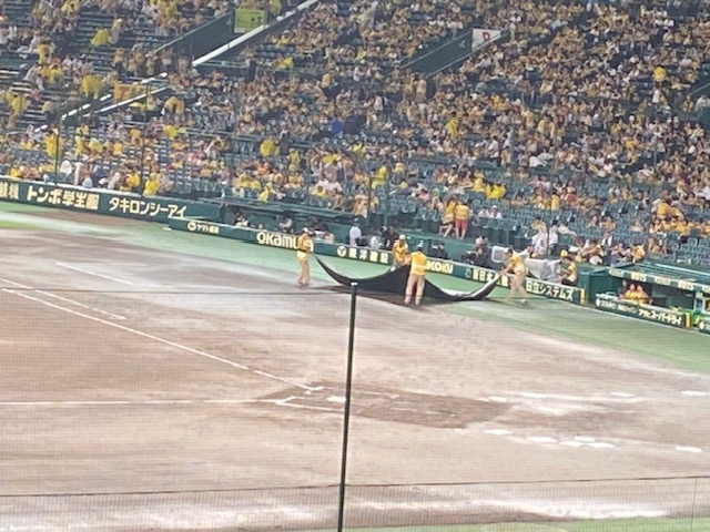 2点先生の後満塁ホームランで6点ビハインドの中ポツポツと雨が降り出しました。